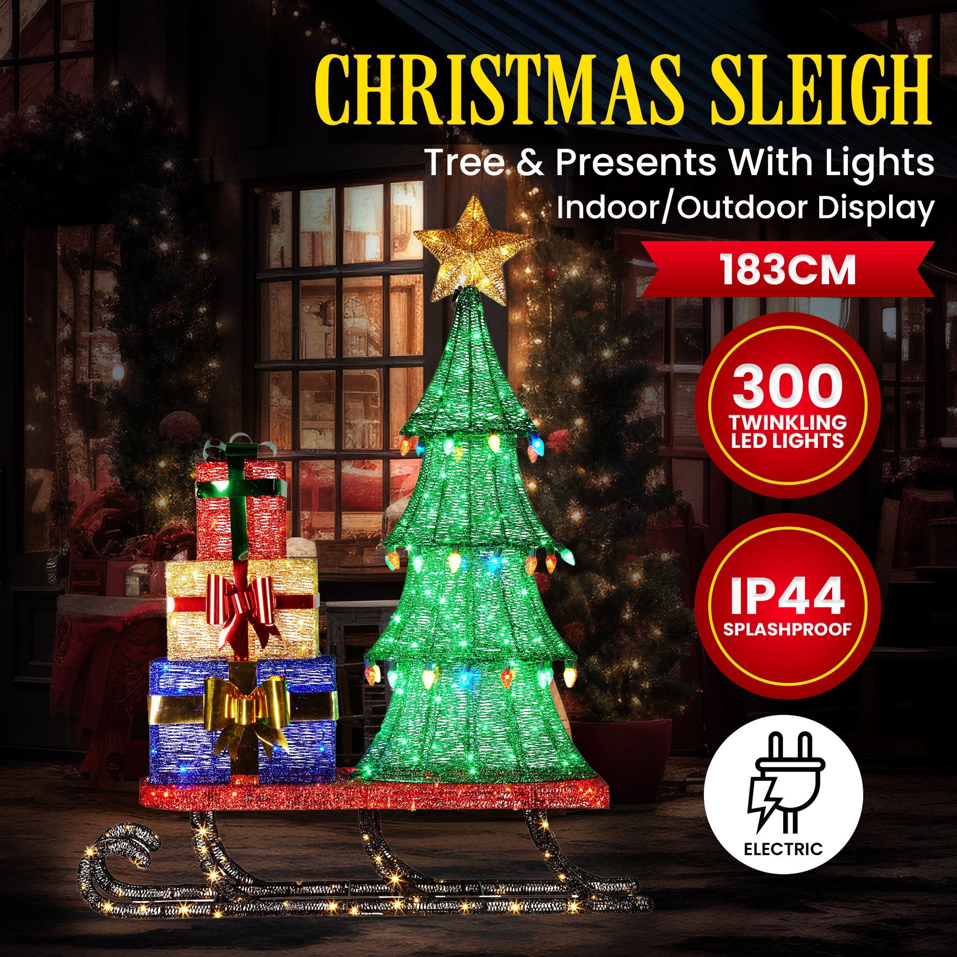 Get ready for some serious festive vibes with this magical Christmas display sled, adorned with a tree and gifts on top. Its decked out with 34 multi-coloured C9 lights and 300 warm white LEDs that twinkle, creating a mesmerizing effect. This display is guaranteed to add a touch of dazzle to your holiday setup. Spread the holiday spirit and light up your space with this charming decoration.
