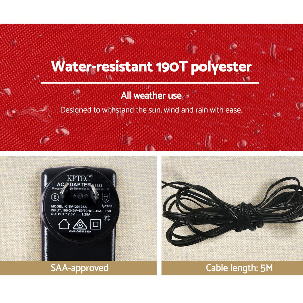 Spread some good cheer this Christmas with the Jingle Jollys 2.2m Inflatable Santa and Tree set. An eye-catching and vivid display that will certainly brighten up the spirit of the season. Made of weather-resistant polyester fabric, our inflatable Christmas décor comes with great features such as built-in lighting projection, five cool white LEDs and a built-in fan for easy inflation. Also pegs and ropes included to ensure our cheerful ensemble stand strong, firm and steady all season long. Comes with zipper for fast deflation. Not least, use the ensemble outdoors or indoors with minimum hassle.